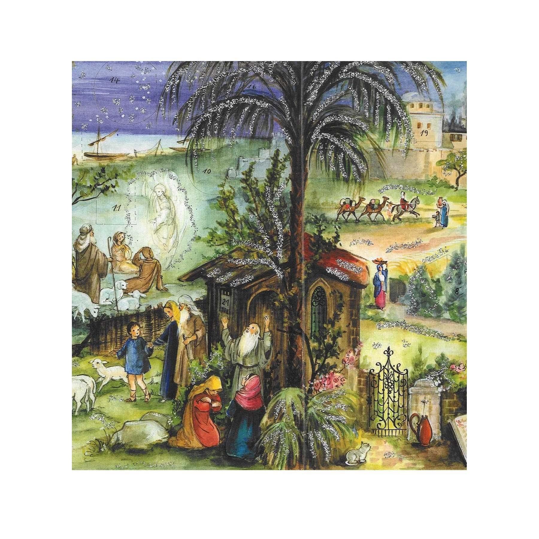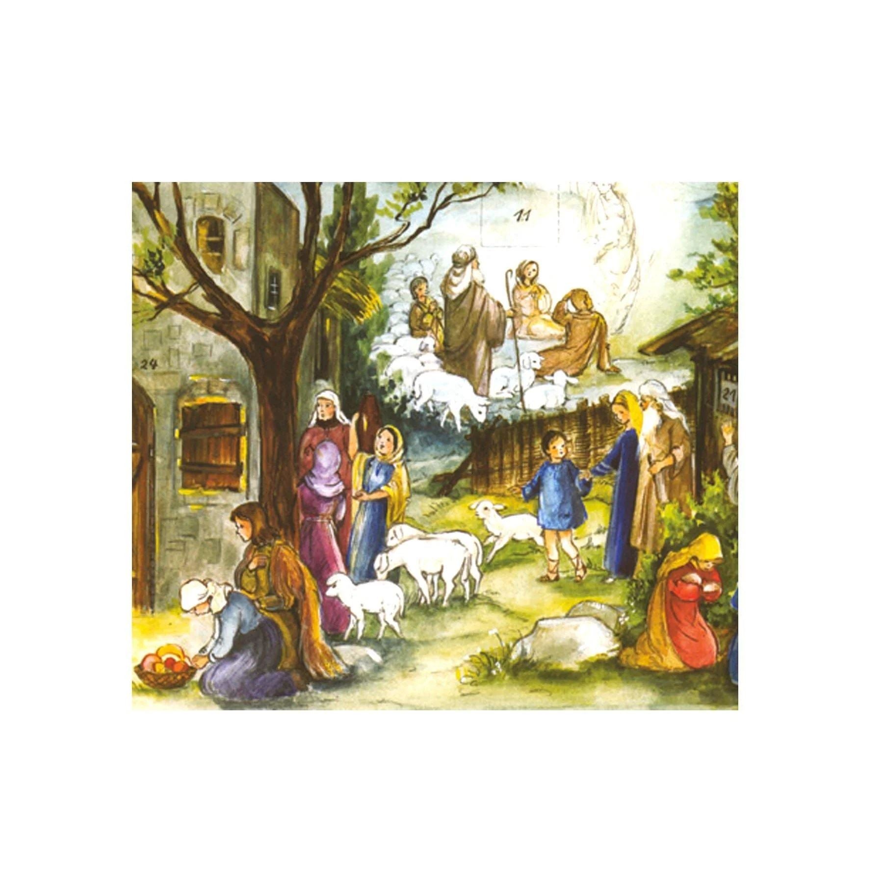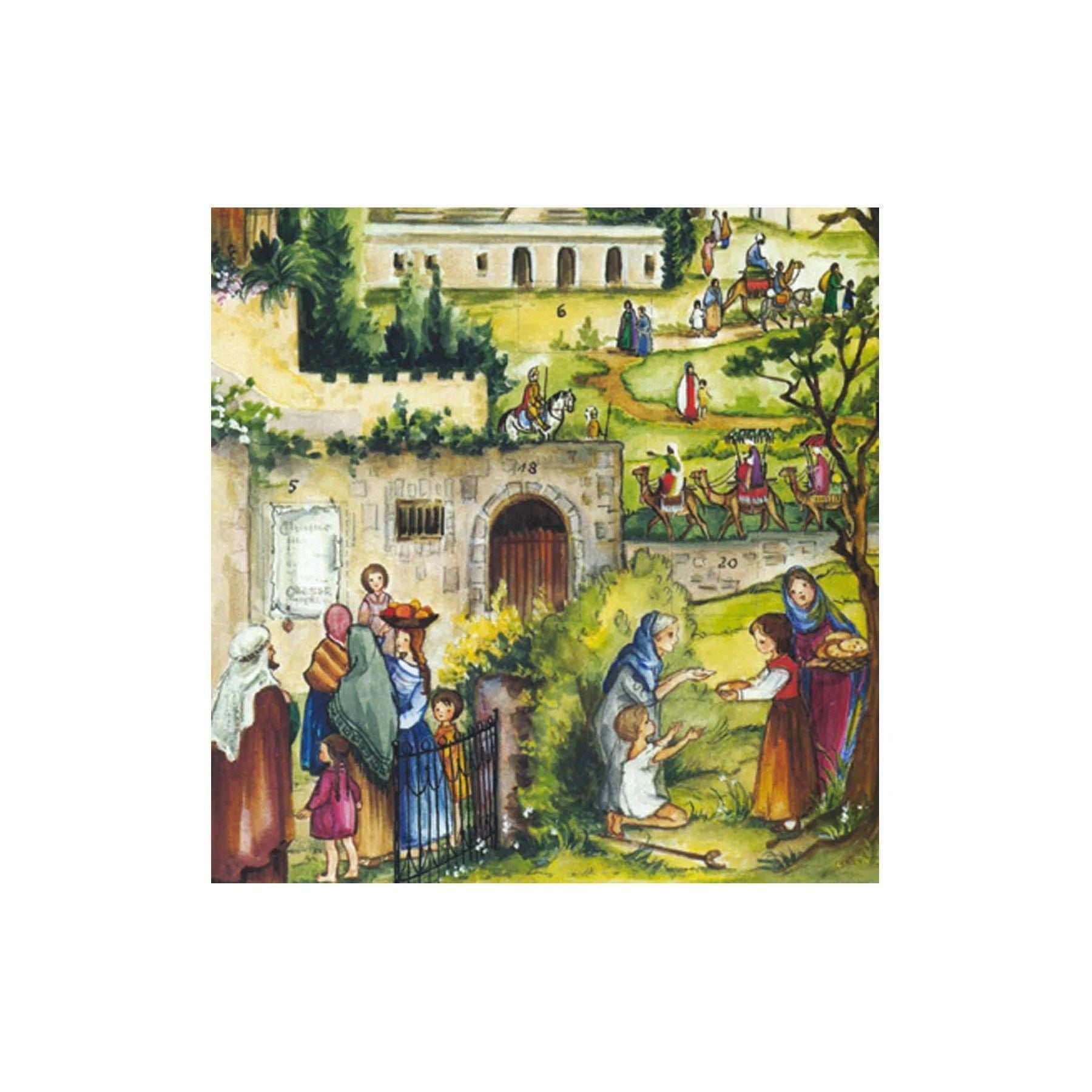 A Christmas advent calendar with harmonious colours depicts scenes from the Christmas story, including the angel's visit to shepherds and the Three Kings at the stable.