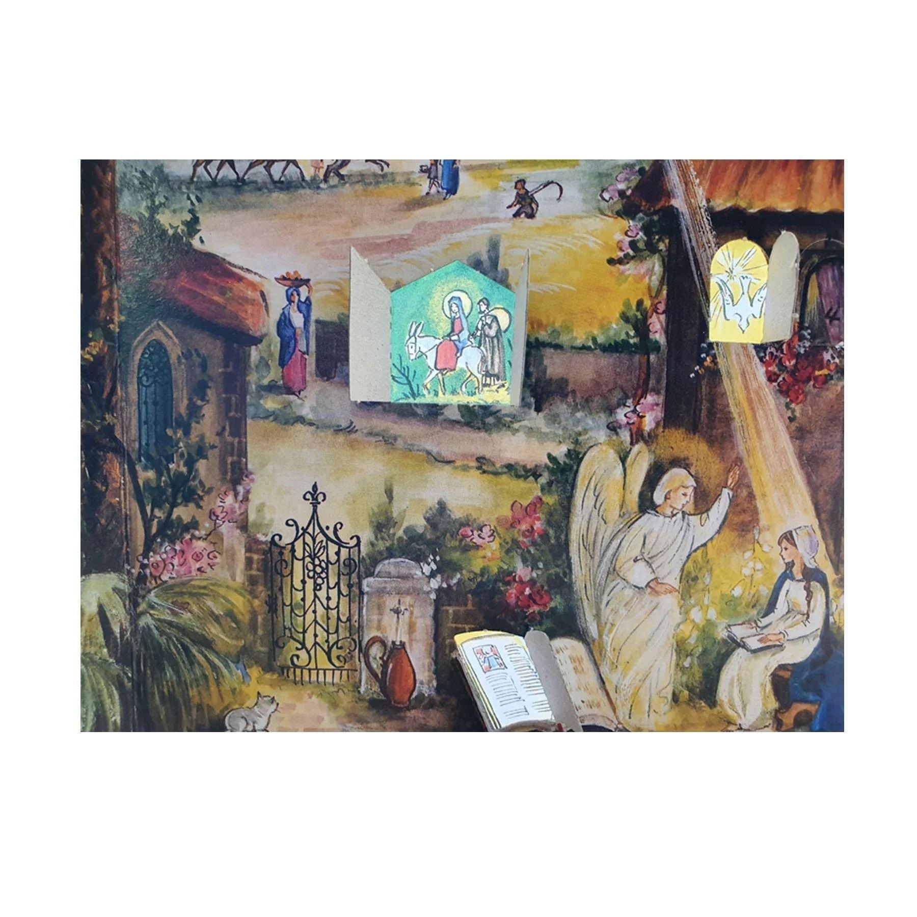 ADVENT CALENDAR | This panoramic Christmas advent calendar is a harmoniously coloured masterpiece. It showcases scenes from the Christmas story, including the angel's visit to the shepherds, the Three Kings at the stable, and the angel Gabriel with the Virgin Mary. Discover more behind each door. Perfect for setting up or hanging.