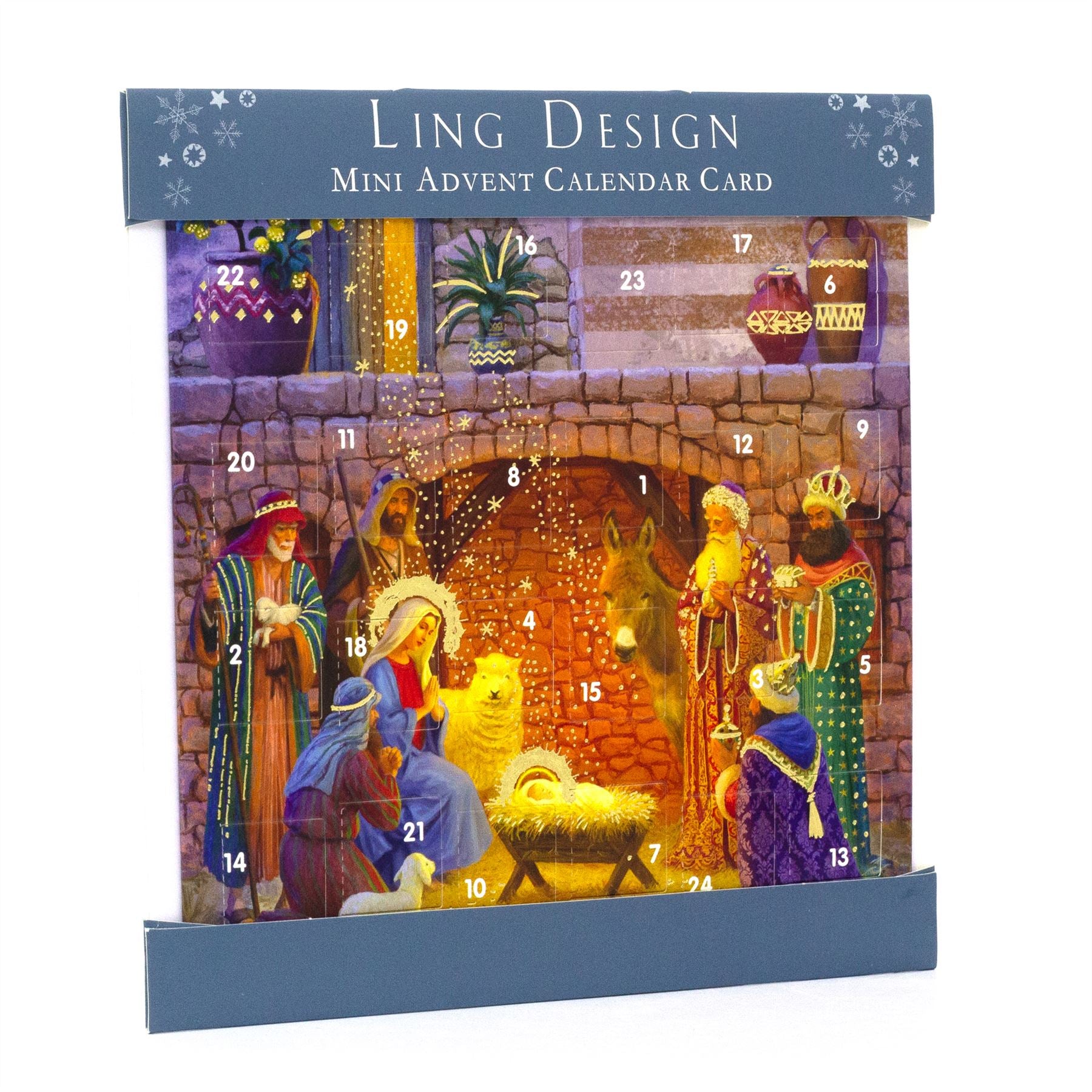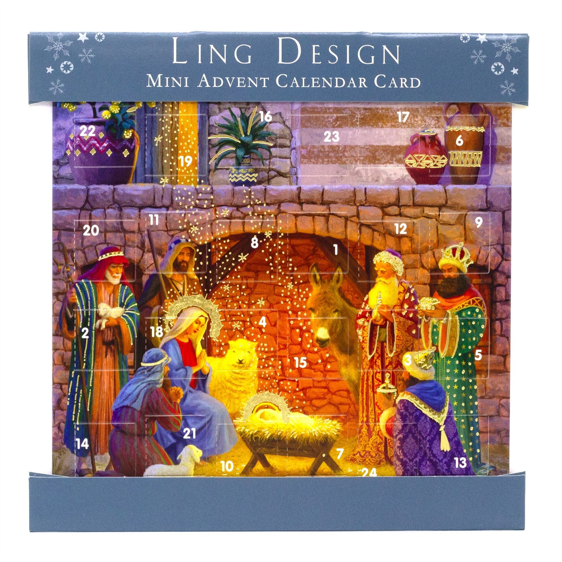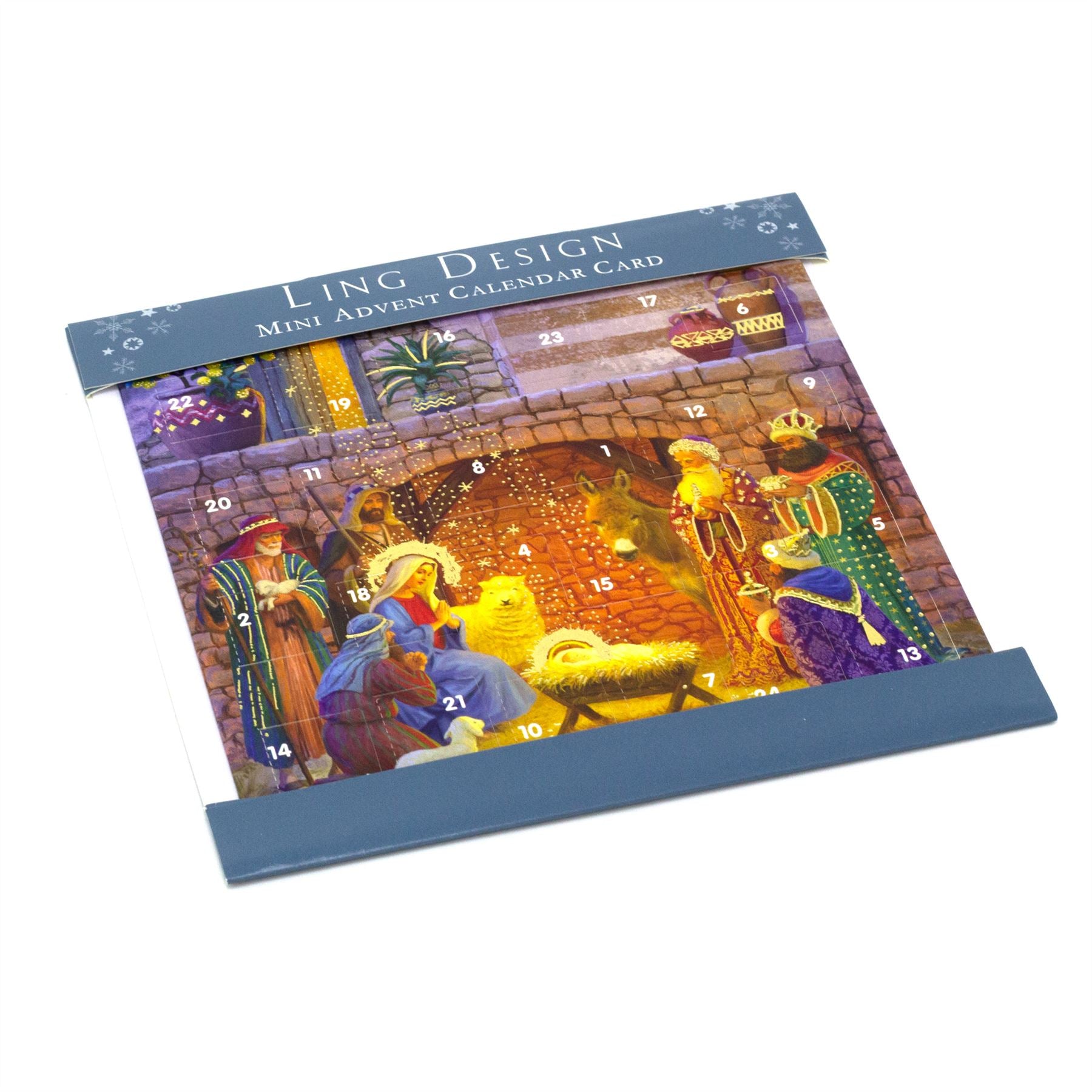 Discover the true meaning of Christmas with the Nativity Advent Calendar Greetings Card. Featuring a traditional nativity scene with kings and shepherds around the Holy Family, this classic card offers 24 doors that reveal festive illustrations, creating daily joy throughout Advent