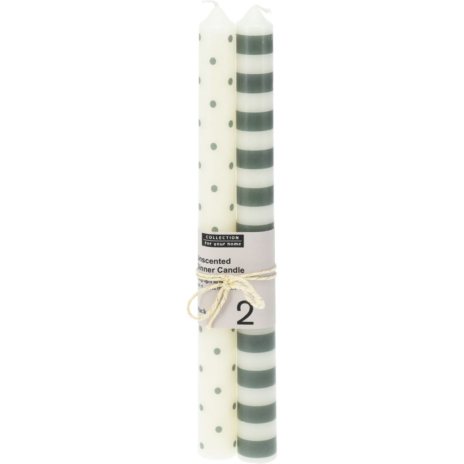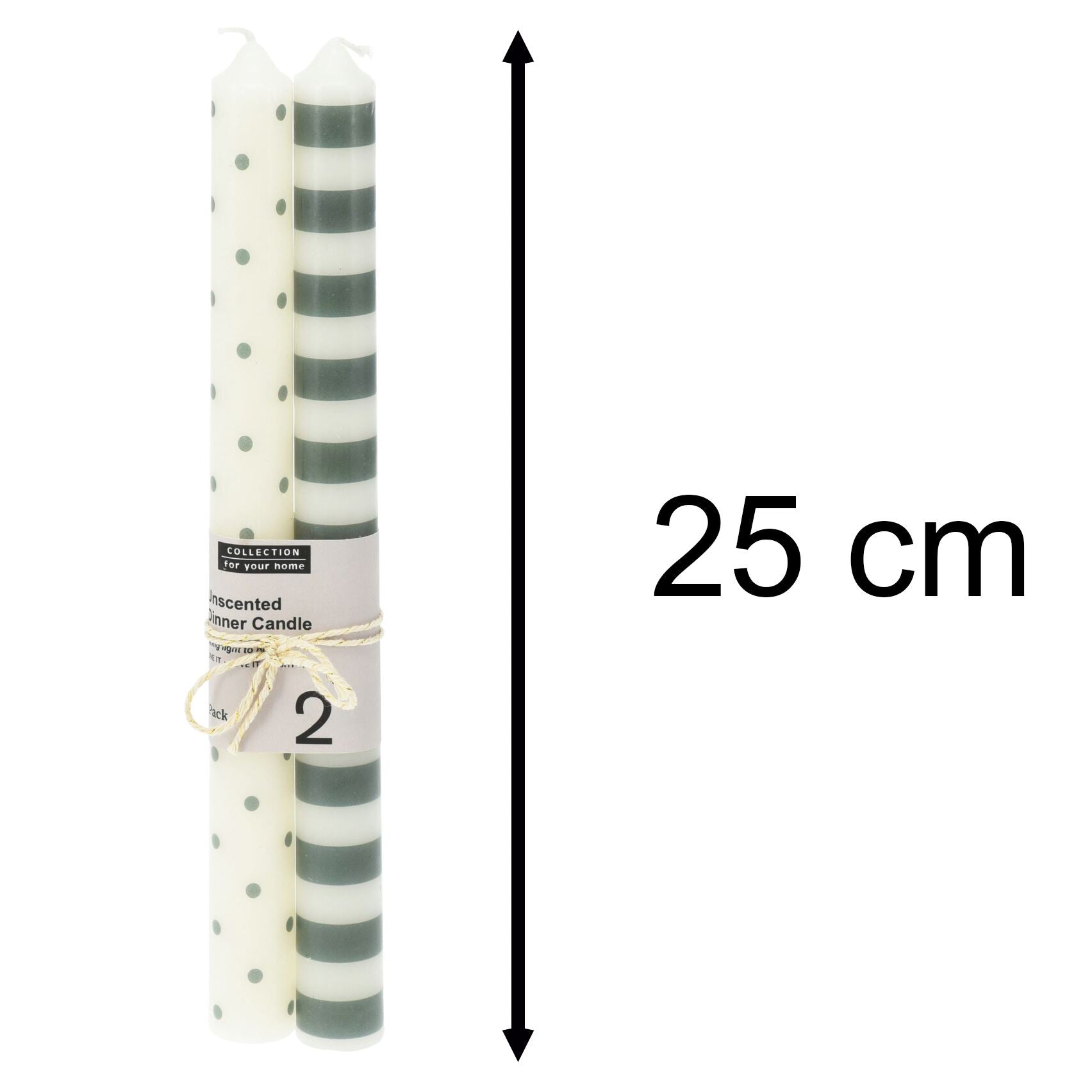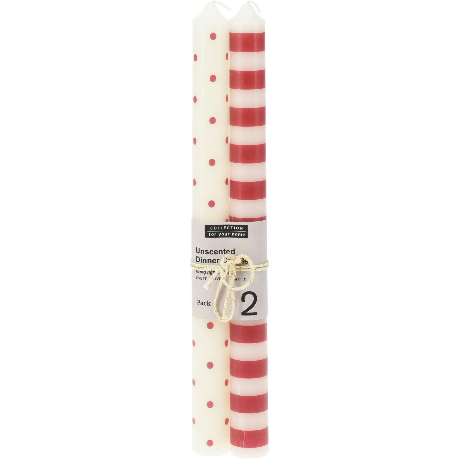 Add festive magic to your table with this Pair of Christmas Tapered Dinner Candles. Each set includes two unscented candles, decorated with stylish stripes or polka dots. Standing at 25 cm tall, they provide a warm, beautiful glow and make the perfect gif
