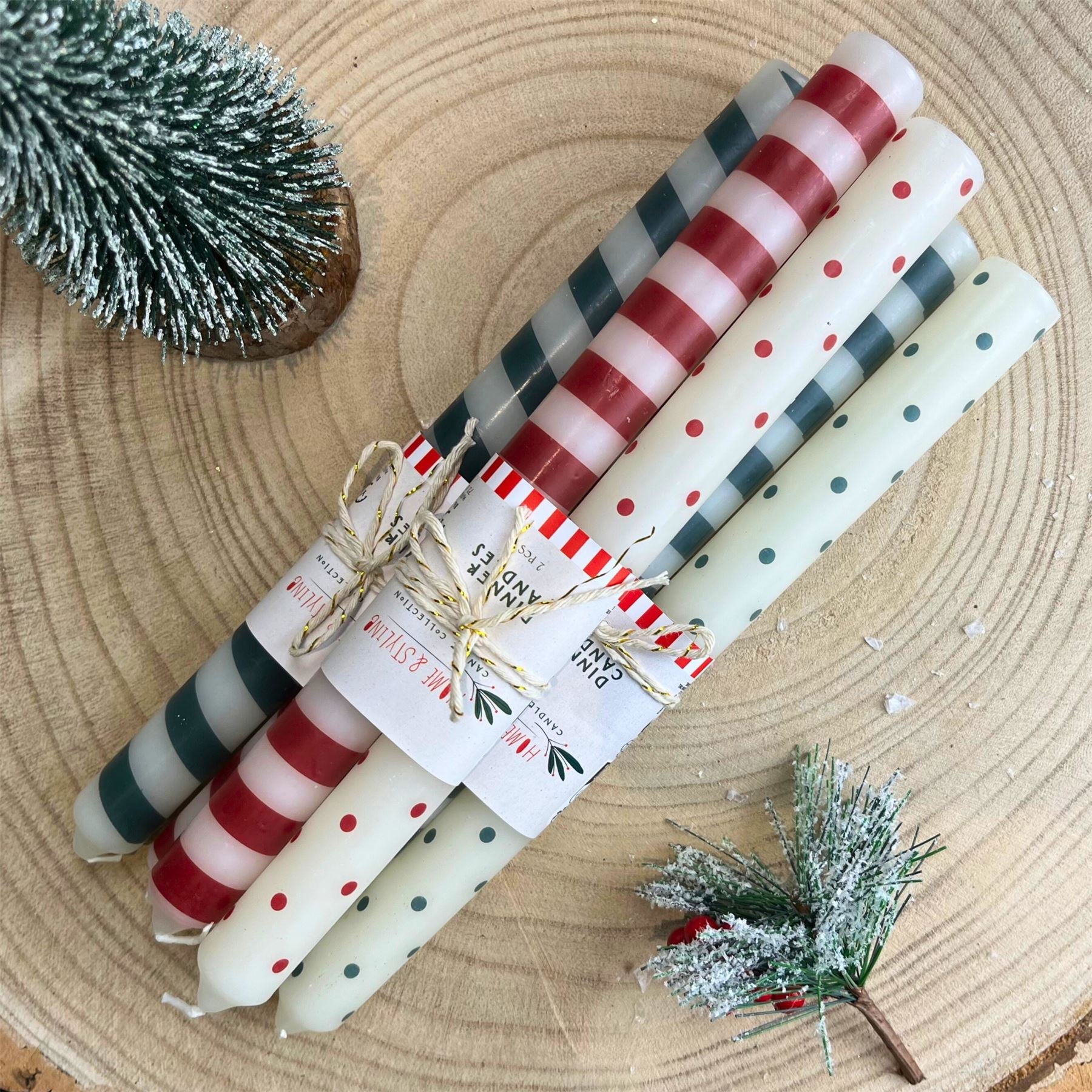 DINNER CANDLES | These unique Christmas candles come in a chic selection of festive patterns, with playful polka dots or trendy stripes in vibrant colours, perfect for adding charm to any holiday setting