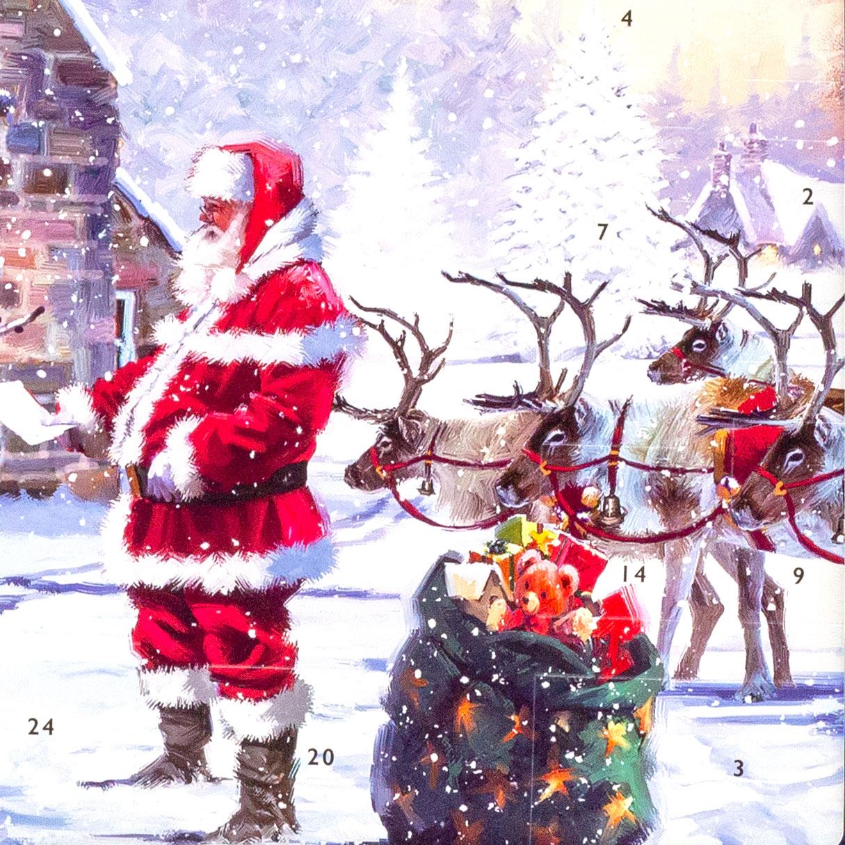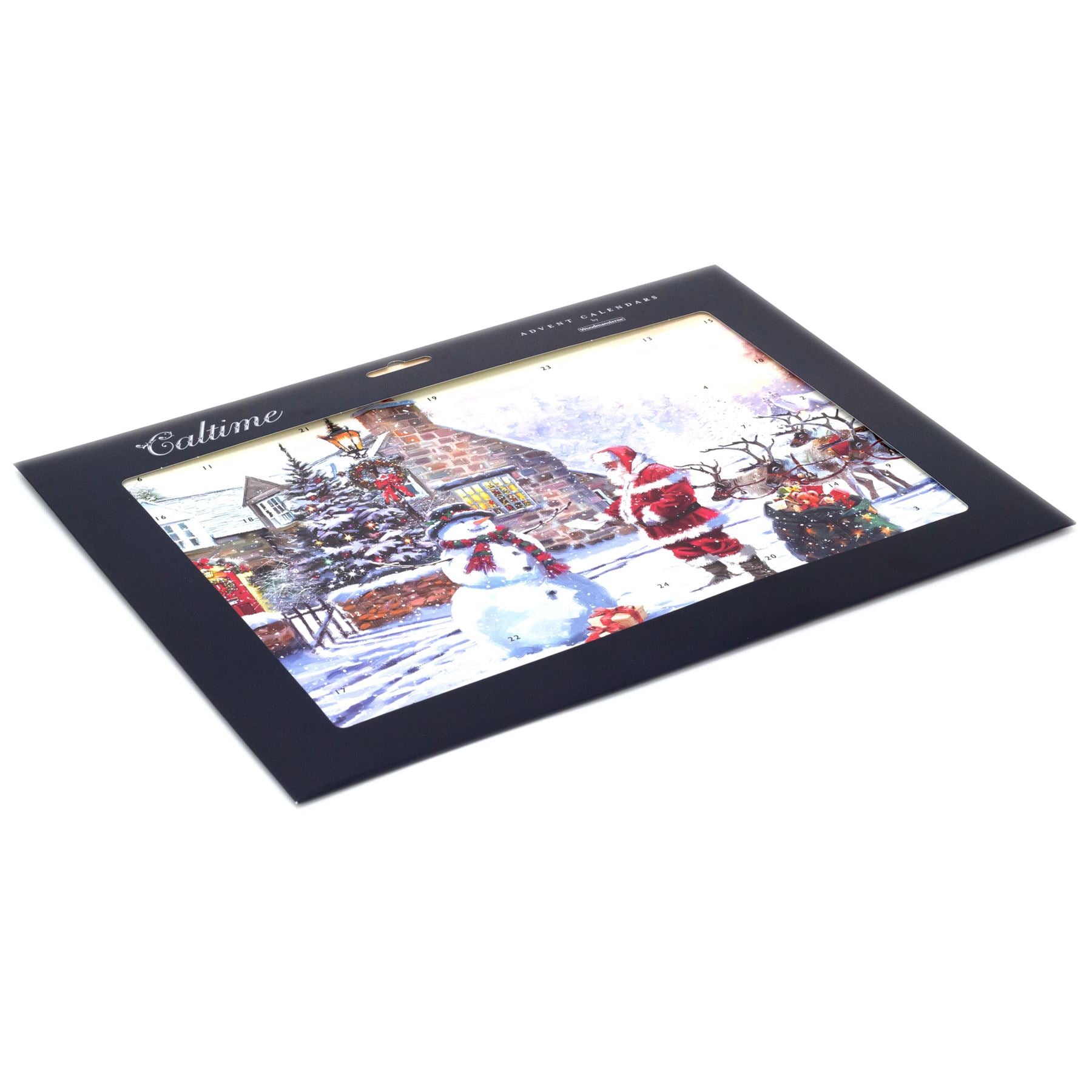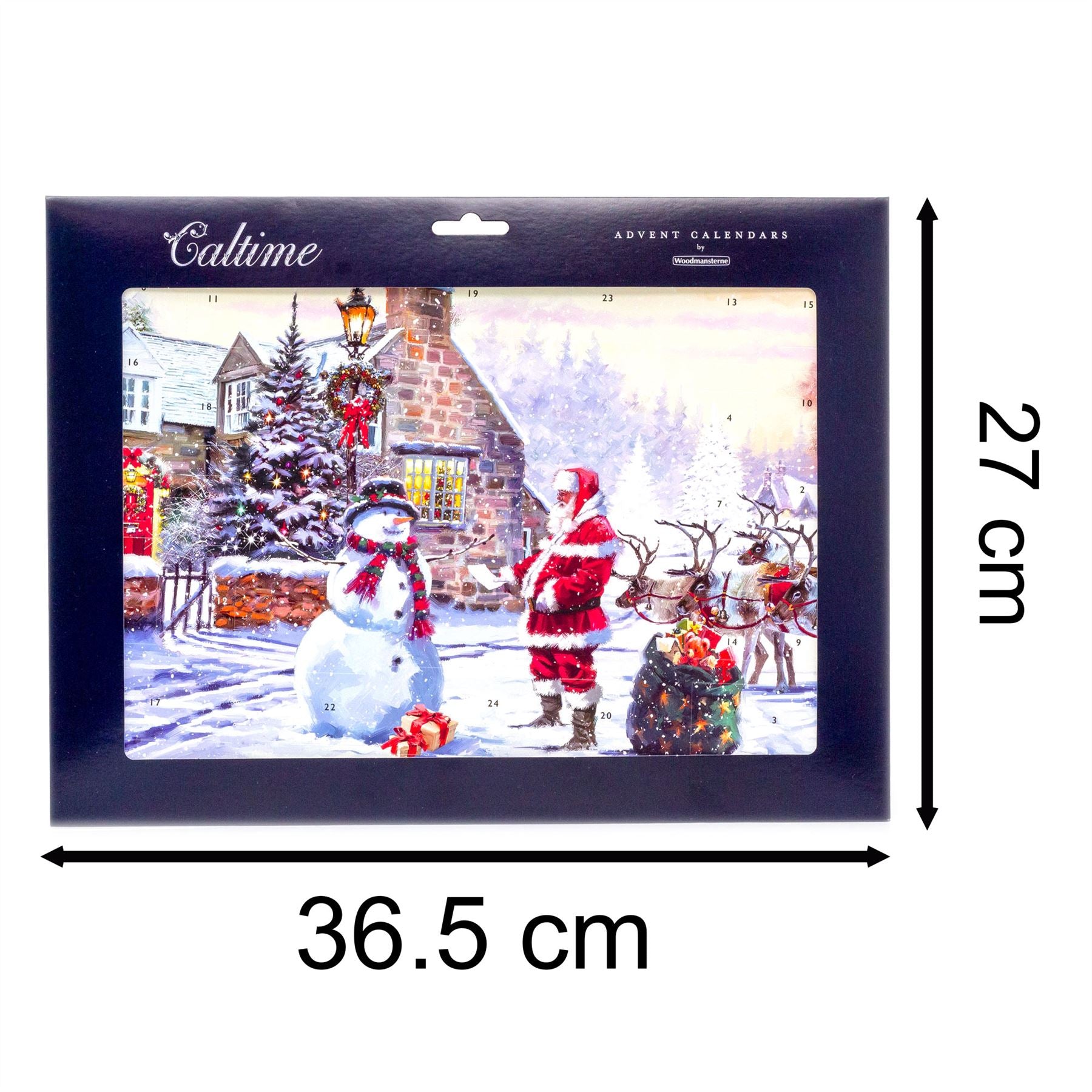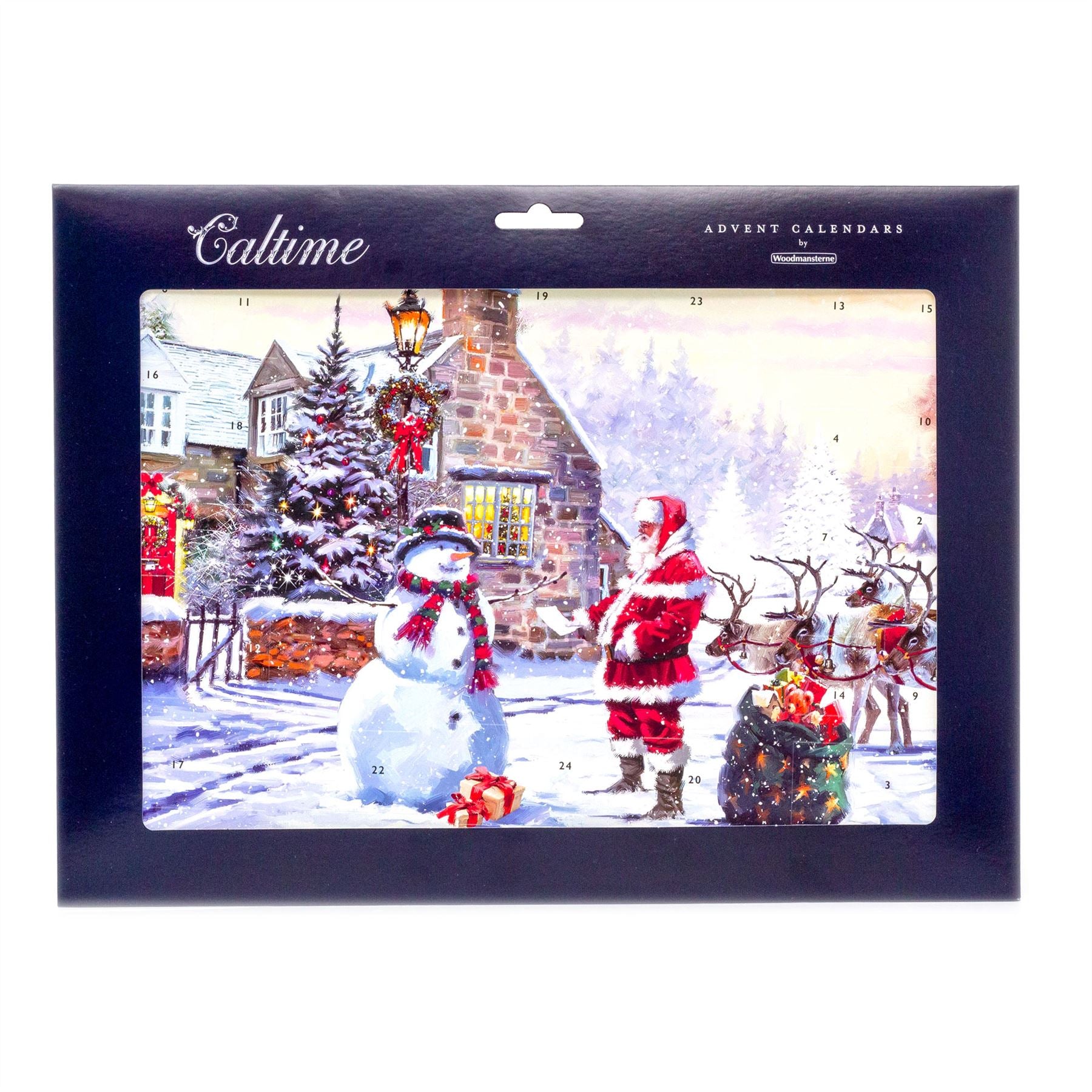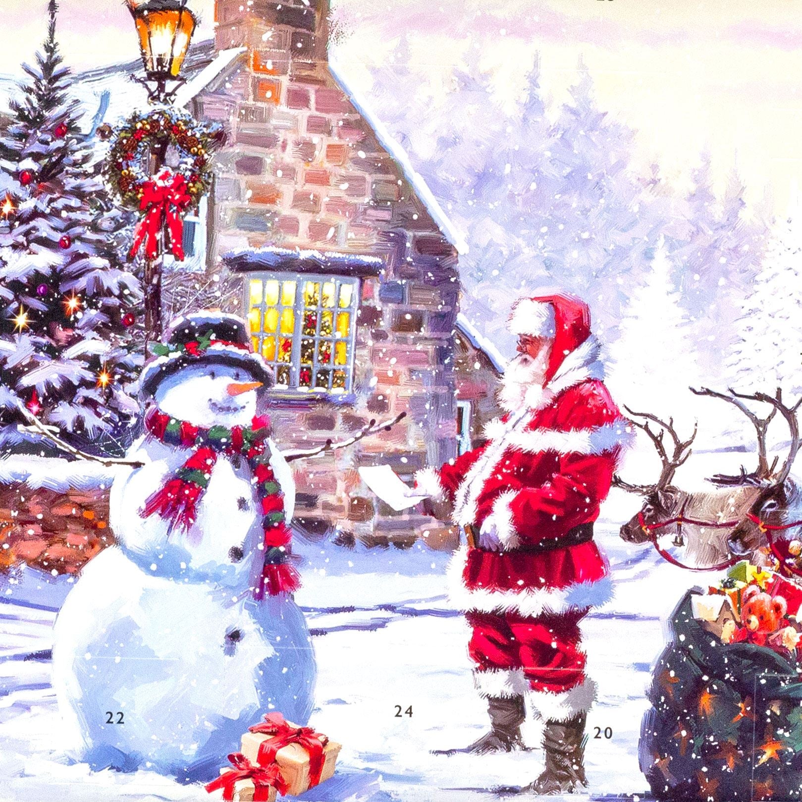 CHRISTMAS ADVENT CALENDAR | Embrace the festive spirit with our Santa & The Snowman Advent Calendar. It showcases a charming snowy English country scene with Santa, his reindeer, and a delightful snowman