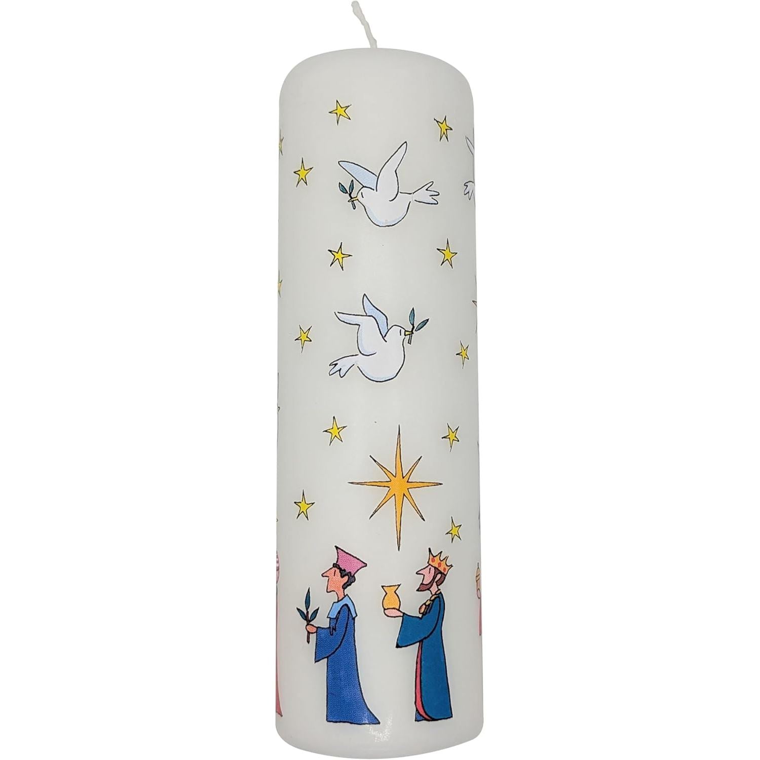 COLOURFUL DESIGN & PRINT | Features three Wise Men with stars and doves in vibrant, colourful print on a traditional white wax candle for a joyful festive touch